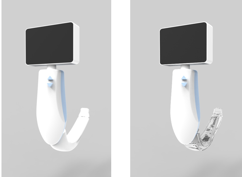 新型角度可调视频喉镜,主要解决目前临床使用中存在的三大问题。第一、针对目前的视频喉镜在使用中由于操作因素及本身使用方式的限制,挑起会厌困难,声门暴露不佳,造成困难气道,且容易对患者牙齿造成二次损伤的问题;第二、使用了新式的薄膜耗材,在降低成本的同时,有效降低了耗材的体积,更有利于对小儿以及气道入口狭窄的患者进行插管操作;第三、采用流动气体进行前端除雾,解决插管中喉镜镜头或者前端耗材因为温差而造成的凝雾问题。
